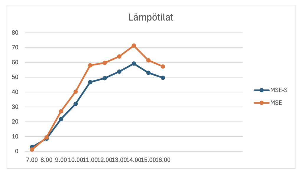 Ero huipussaan oli 12,1 °C. Koko aurinkoisen päivän MSE-S pysyy johdonmukaisesti viileämpänä kuin vertailuikkuna.