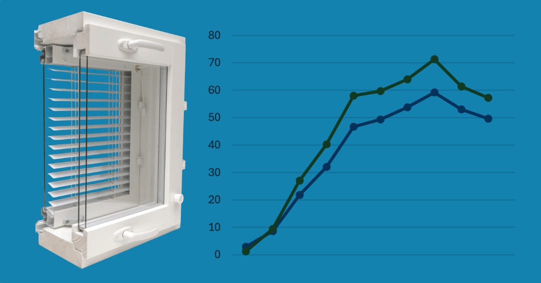 Mittaus vahvistaa sen, mitä uusi innovaatiomme lupaa: integroidut ulkokaihtimet pitävät ikkunan merkittävästi viileämpänä kuin tavallinen malli. Jo huhtikuun keväisissä olosuhteissa ero oli parhaimmillaan 12 astetta.